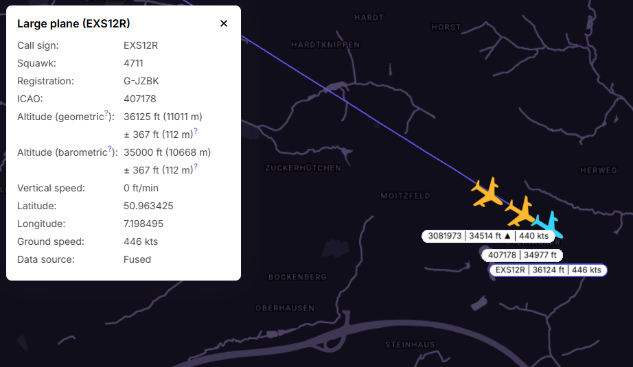 3) The graphic illustrating the aircraft and its flight path is generated from the received Mode-S signals. The altitude and horizontal position are determined using the INVOLI MLAT algorithm. The track line may appear somewhat jagged due to inaccuracies in the positioning calculations, but it is expected to closely follow the ADS-B track when it is avaiable.